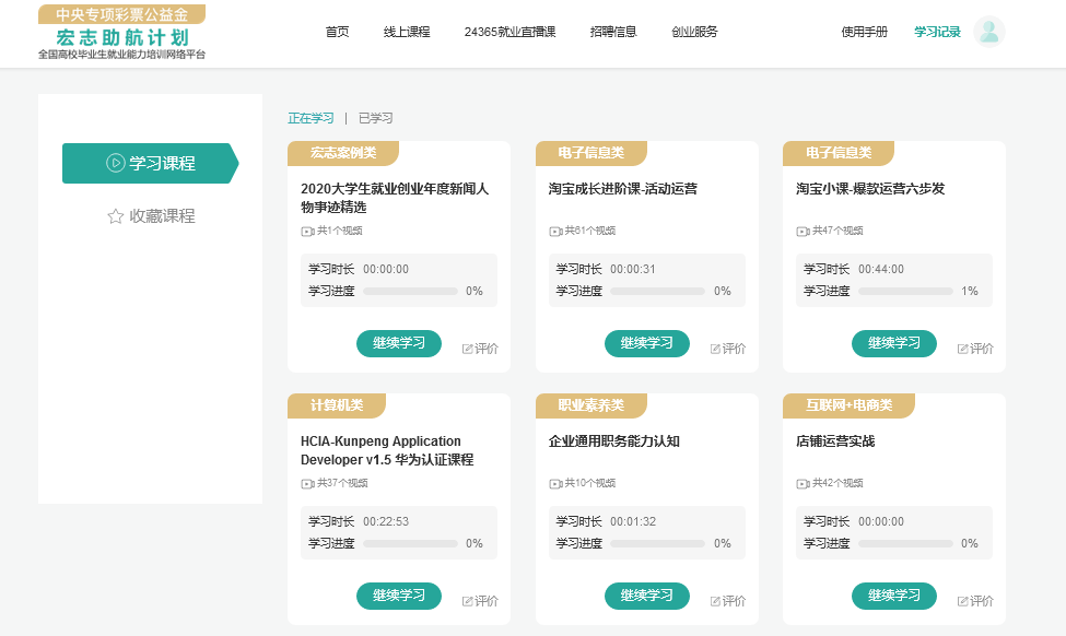 点击右上角“学习记录”,可以查看正在学习/已学习、收藏的课程。学习进度超过20%,可对课程做出评价。