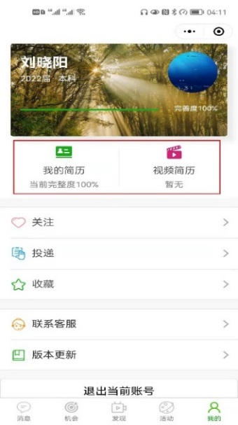 登录本校学生就业小程序,进入“我的”,点击“我的简历”编辑或完善文字简历,点击“视频简历”编辑或上传视频简历。