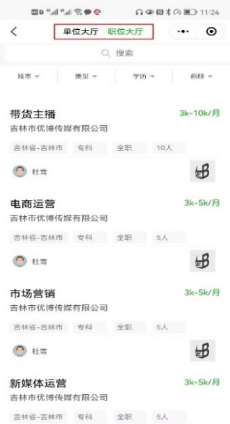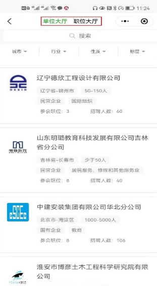 (2)查找企业和职位:查找企业请进入“企业大厅”,进入企业详情可查看企业信息和该企业发布的所有职位,查找全部职位请进入“职位大厅”,进入职务大厅可以查看本场活动企业发布的全部职位。