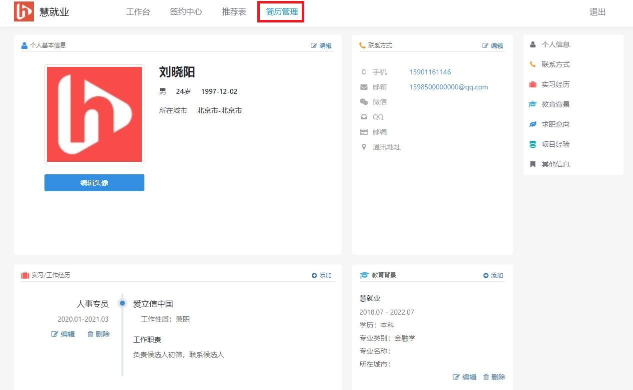 PC端编辑文字简历编辑请登录:https://www.hjiuye.com/page/personalResume/login登录用户名和密码与手机端相同,登录后进入“简历管理”编辑文字简历。