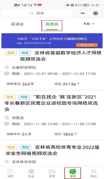 登录本校学生就业小程序,进入“活动-双选会”,本场双选会置于双选会频道最上方,活动开始前点击“报名/入场”完成报名,报名后可入场搜索企业和职位、投递简历,给HR留言。