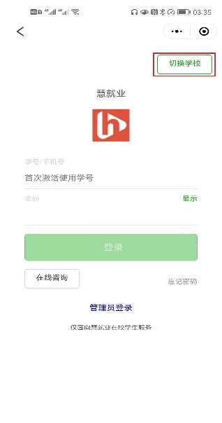 请扫描上方学生就业小程序二维码,搜索选择本学校,进入本校学生就业小程序。首次登录请使用学号激活账号,初始密码为123456,账号激活后请绑定手机,设置新密码后重新登录。扫码后如进入的页面不是本校学生就业小程序,请进入“我的”,点击上方“切换学校”,切换至本学校,如已登录本校学生就业小程序,扫码后直接弹出本校学生就业小程序。